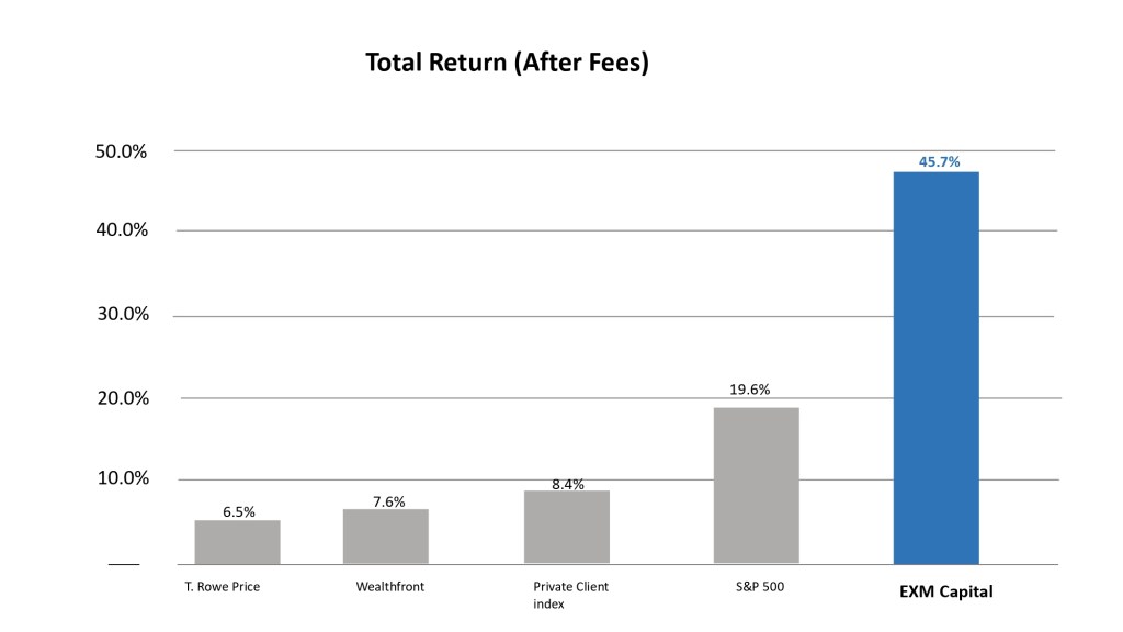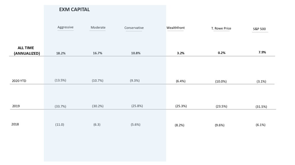 EXM clients are now up +12-8% YTD (vs. S&P 500 down -3% and advisors like Wealthfront and Betterment down -6% to -10%)